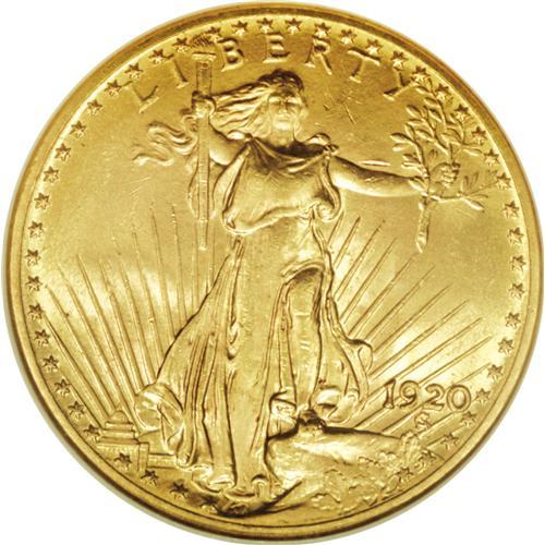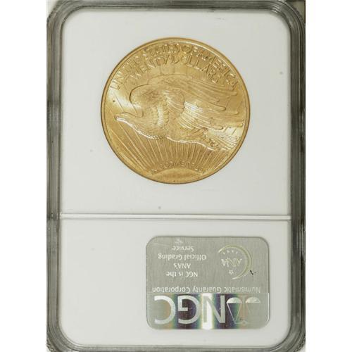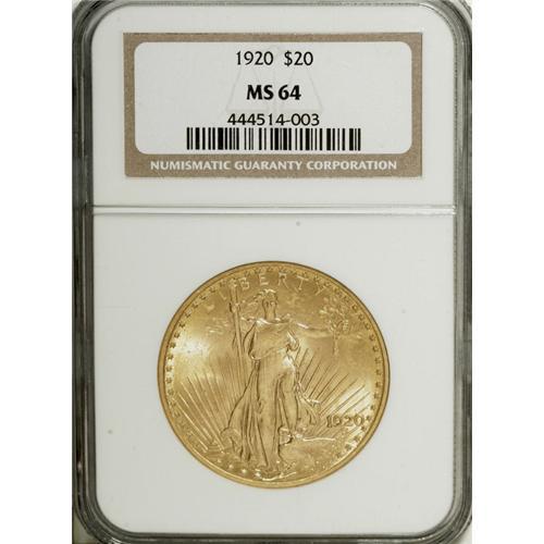<B>1920 $20 MS64 NGC.</B></I> The 1920 has less than half the mintage of the 1920-S, but the latter is a formidable rarity, presumably because virtually the entire mintage remained in Treasury holdings. This 1920 double eagle is a delightful near-Gem with brilliant yellow-gold surfaces and frosty luster. Examples are not difficult to locate at this grade, but finer pieces are extremely rare. As of (4/07), NGC has only certified seven higher grade coins.<BR><BR><b>Shipping:</b> Coins & Currency (<a target="_blank" href="http://www.heritageauctions.com/common/shipping.php">view shipping information</a>)