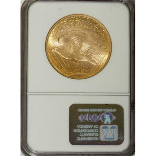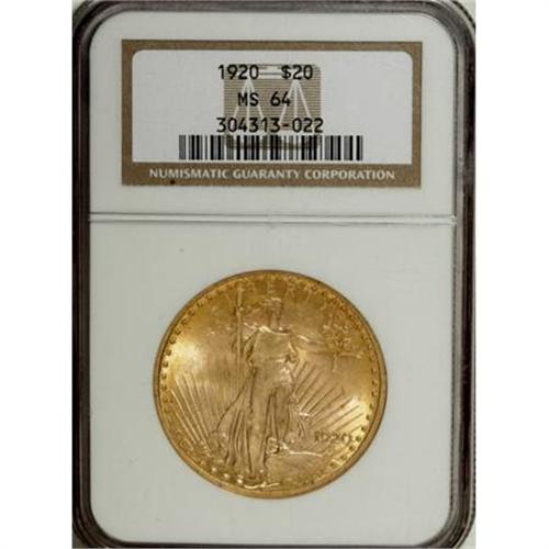 <B>1920 $20 MS64 NGC.</B></I> This is a lovely rose-gold double eagle with intense luster and a vibrant overall appearance. The striking details are generally strong, further enhancing the coin's overall eye appeal. A handful of grade-limiting abrasions are noted on each side of the coin.<BR><BR><B>Coin Engraver:</B> Augustus Saint-Gaudens<BR><BR><b>Shipping:</b> Coins & Currency (<a target="_blank" href="http://www.heritageauctions.com/common/shipping.php">view shipping information</a>)