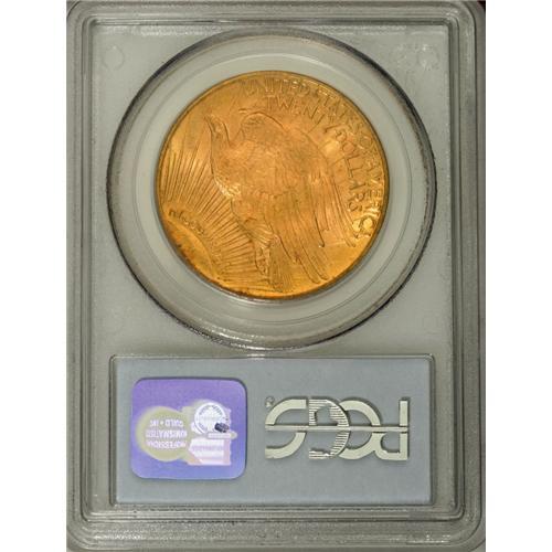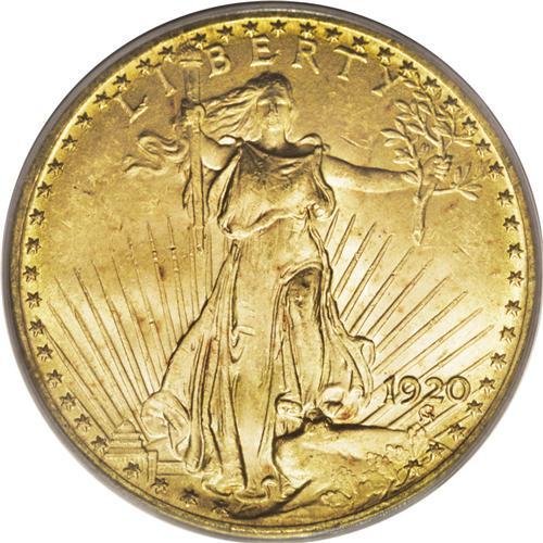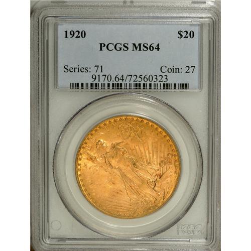 <B>1920 $20 MS64 PCGS.</B></I> Despite the relatively low mintage of 228,250 pieces, the 1920 double eagle is quite common through the MS63 grade level. Near-Gems like this specimen are available with a little patience and searching, and higher-grade coins are virtually unobtainable. The present MS64 coin exhibits rich honey-gold patina and pleasing luster, and its design features stand out nicely. Some small abrasions on Liberty's head and left leg and the eagle's facing leg account for the grade.<BR><BR><b>Shipping:</b> Coin/Currency (<a target="_blank" href="http://www.heritageauctions.com/common/shipping.php">view shipping information</a>)