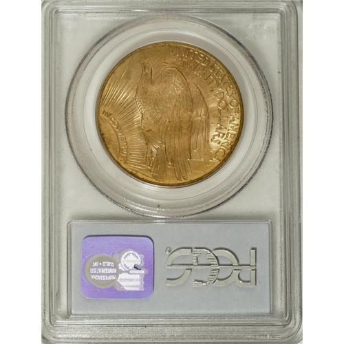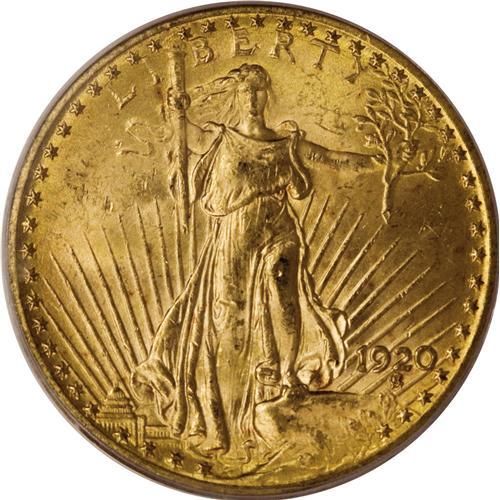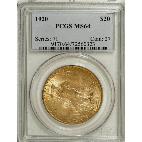 <B>1920 $20 MS64 PCGS.</B></I> Despite the relatively low mintage of 228,250 pieces, the 1920 double eagle is quite common through the MS63 grade level. Near-Gems like this specimen are available with a little patience and searching, and higher-grade coins are virtually unobtainable. The present MS64 coin exhibits rich honey-gold patina and pleasing luster, and its design features stand out nicely. Some small abrasions on Liberty's head and left leg and the eagle's facing leg account for the grade.<BR><BR><b>Shipping:</b> Coins & Currency (<a target="_blank" href="http://www.heritageauctions.com/common/shipping.php">view shipping information</a>)
