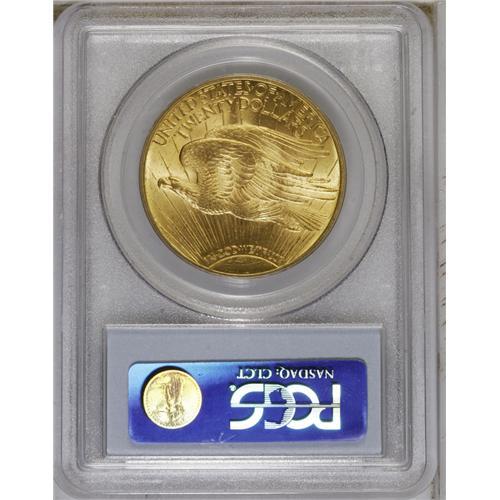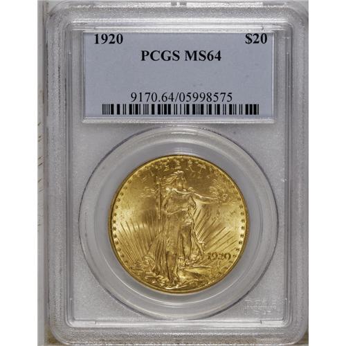 <B>1920 $20 MS64 PCGS.</B></I> Excluding the non-collectible 1933, which issue in the Saint-Gaudens series has the lowest PCGS population in MS65 and better? That would be the 1920, which is represented in MS65 by one piece, with none graded finer. The 1920 is thus arguably the greatest conditional rarity in the series. This lustrous khaki-gold example has a tick on the chin and a few wispy obverse grazes, but the strike is sharp, and the reverse is well preserved.<BR><BR><b>Shipping:</b> Coin/Currency (<a target="_blank" href="http://www.heritageauctions.com/common/shipping.php">view shipping information</a>)