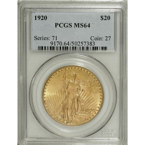 <B>1920 $20 MS64 PCGS.</B></I> Fully lustrous with satiny yellow-gold surfaces and exceptional eye appeal. This is quite a low-mintage issue with a total production of just 228,250 coins, and it is rare at the Gem grade level. None have so far been certified any finer than MS65 by either NGC or PCGS (2/07).<BR><I>From The Greg Southward Collection.</B></I><BR><BR><b>Shipping:</b> Coins & Currency (<a target="_blank" href="http://www.heritageauctions.com/common/shipping.php">view shipping information</a>)