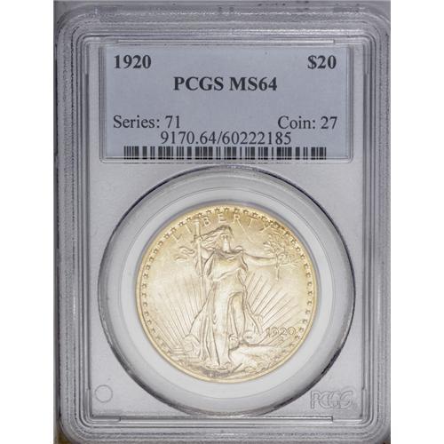 <B>1920<$20> MS64 PCGS.</B></I> Satiny and highly lustrous, the bright surfaces have a reddish copper-gold patina and display few grade-limiting surface marks. An elusive near-Gem survivor, and we anticipate that this example will elicit considerable bidder activity when its appears at auction. Just one coin (!) has been graded higher, by PCGS (2/06).