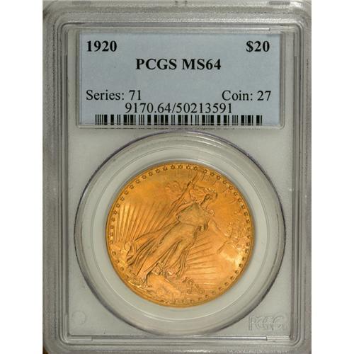<B>1920 $20 MS64 PCGS.</B></I> The rich apricot toning is attractive, and the fields are well preserved. Concealed marks on the back wing feathers and on the Capitol dome combine to limit the grade. The 1920 has less than half the mintage of the 1921, yet the latter is a formidable rarity. Apparently, virtually all of the 1921 remained in Treasury holdings at the time of the 1933 gold recall, while a few bags of 1920 twenties escaped to foreign bank reserves.<BR><BR><b>Shipping:</b> Coin/Currency (<a target="_blank" href="http://www.heritageauctions.com/common/shipping.php">view shipping information</a>)