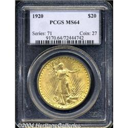 <B>1920<$20> MS64 PCGS.</B></I> Available once in a while in near-Gem condition, the 1920 is rarely seen as a Gem. This is a well struck example that has exemplary luster characteristics and a couple of minor alloy spots on each side that do not affect the overall eye appeal of the coin; and in fact, appear to be nothing more than a slight deepening of color. <BR><BR><B>Important notice:</B> Heritage usually auctions material at the rate of 200-250 lots per hour. On some occasions eBay Live bid software or the Internet may not be able to keep up with the pace of the auction. We recommend placing a realistic absentee bid now as insurance to avoid disappointment. Occasionally the auctioneer may eliminate or reject an eBay Live bid, and the auctioneer may also reopen a lot after the close of the eBay live bidding (usually because we missed an audience bid), and may reject your bid even if it shows you as the winning bidder. By bidding via eBay Live, you agree that Heritage may award the lot to another bidder at its sole discretion under the circumstances described above or any other reasonable circumstances. Since eBay bids are not shown to us until we open the lot on the floor, we treat those bids just like floor bids. In most cases the floor responds before the eBay bid is presented to us, due to Internet lag time, so for consistency we have made it a policy that floor bids are always considered first over tie eBay live bids. Also please note that all Heritage lots purchased through eBay Live carry a 20% Buyer's Premium. Please make sure you read the Terms and Conditions before you bid. </span></font></tr></table></td></tr></table>