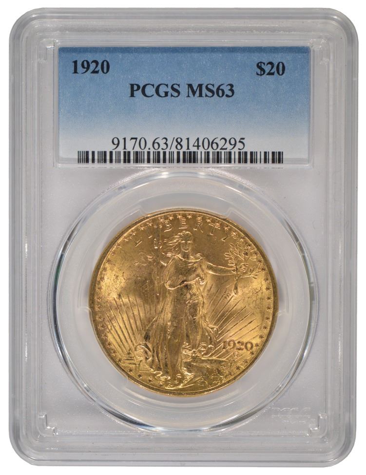 One 1920 $20 Saint Gaudens Double Eagle Gold Coin PCGS MS63.