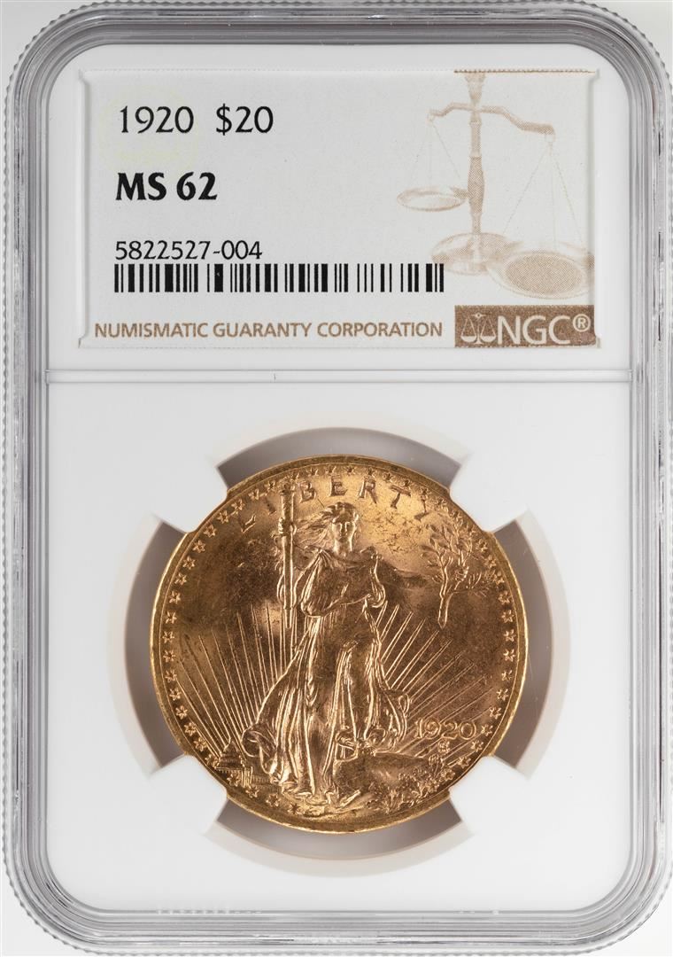One 1920 $20 St. Gaudens Double Eagle Gold Coin NGC MS62. NGC Certified.