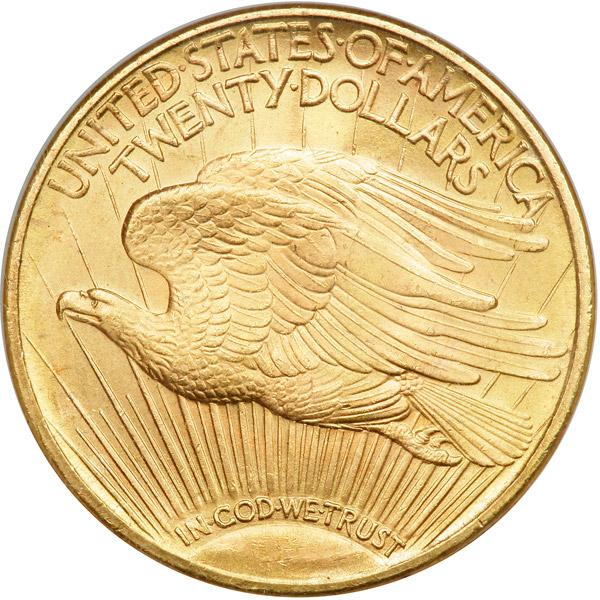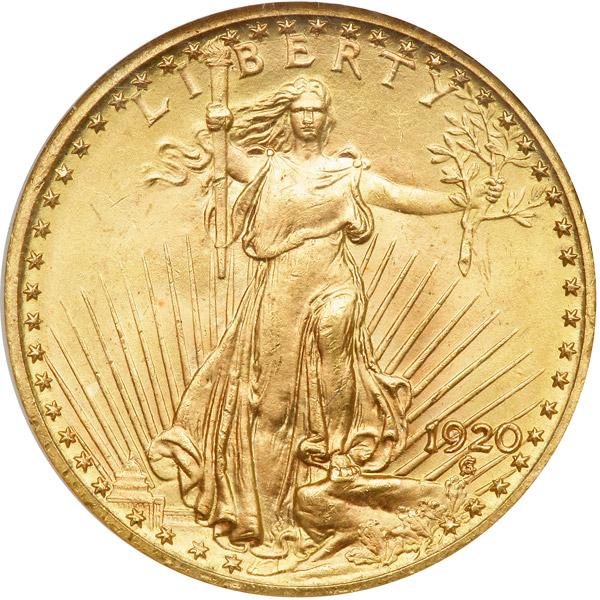 1920 $20 St. Gaudens. NGC graded MS-65. A hint of gold tone. Nicely struck. A major challenge in MS65. This seemingly "nothing to see here" date is comparable in mintage to several other P-mint issues struck in the 'teens and 'twenties. It is easily found -- but only in the lower Mint State grades. The comparison turns on a dime once the Mint State 64 level is breached. Then the 1920-P takes its place and top honors with several other key dates in this fascinating (and beautiful) series of gold coins. Bright satin finish, mimicking the light, swift flutter of a golden butterfly, the field sparkles as when first issued. There are virtually no marks, which places it miles ahead of the others. "Difficult to find" would be too trite a thing to say about so remarkable a 1920-P in MS65 condition. The coin is incredibly hard to find in this grade (see the NGC census for confirmation). Something too worth pausing to study is the fact that all devices were struck with the boldness and desirable consistency of this year, that is, sharply by the dies, which then left behind finely detailed elements of design throughout. Pop 7; none finer at NGC (PCGS # 9170) .