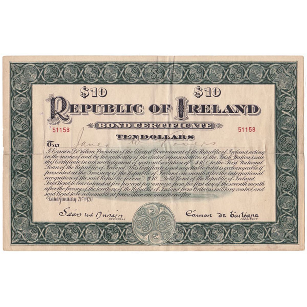 1920 (21 January) Republic of Ireland Ten Dollars Bond issued by Eamon de Valera 1920 (21 January) Republic of Ireland Ten Dollars Bond issued by Eamon de Valera as President of Dail Eireann.