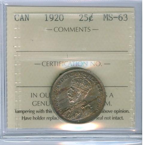 1920 25¢ ICCS MS63. Sharp toning and eye appeal.