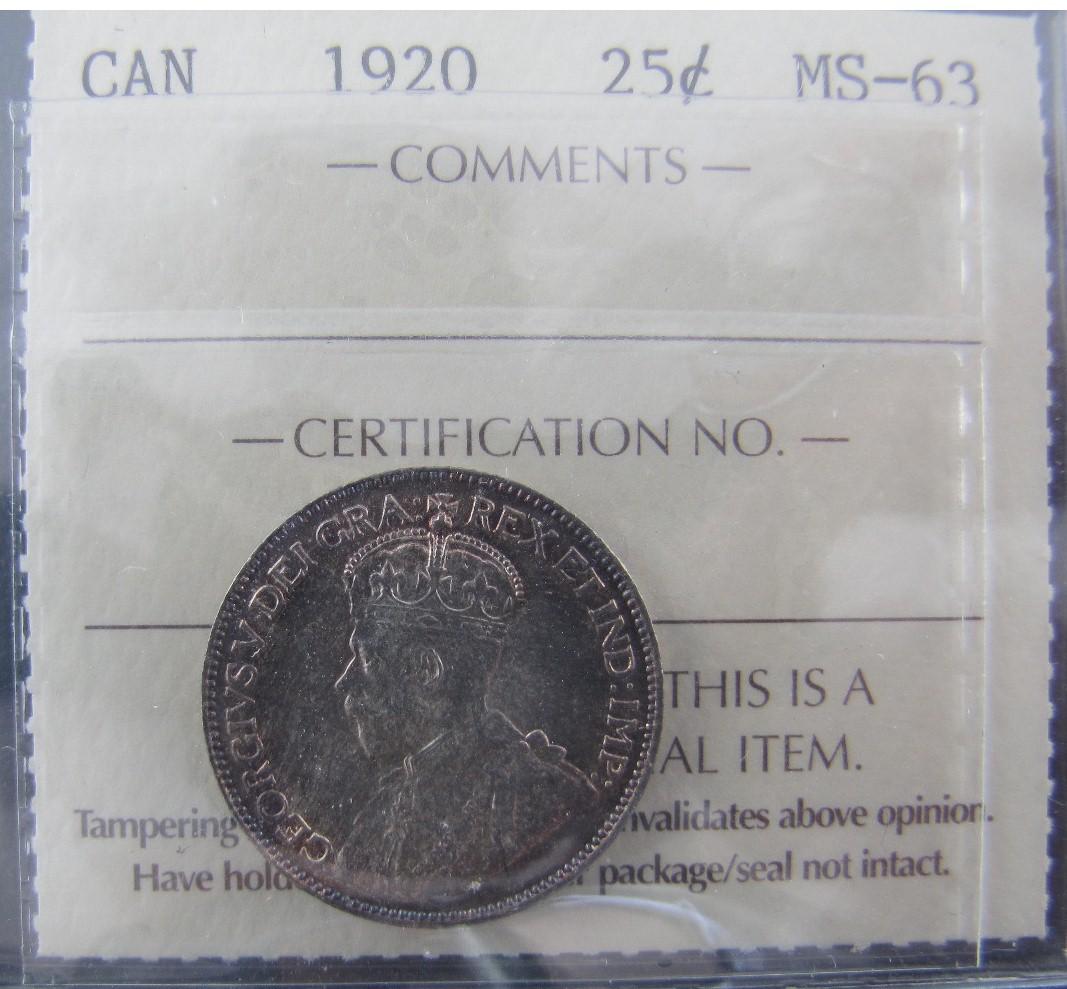 1920 25¢ ICCS MS63. Very light hint of pink and gold tones.