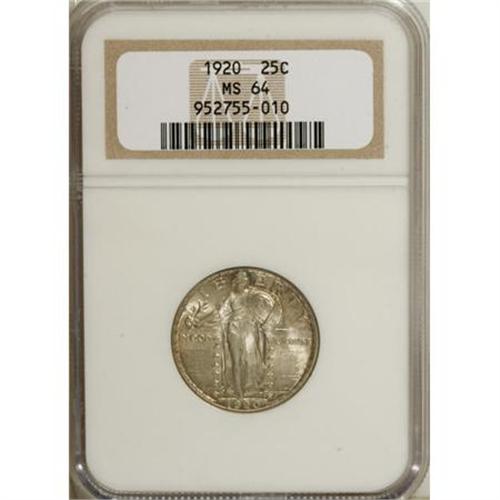 <B>1920 25C MS64 NGC.</B></I> NGC Census: (310/241). PCGS Population (365/214). Mintage: 27,860,000. Numismedia Wsl. Price for NGC/PCGS coin in MS64: $260. (#5734)<BR><BR><B>Coin Engraver:</B> Hermon A. MacNeil<BR><BR><b>Shipping:</b> Coins & Currency (<a target="_blank" href="http://www.heritageauctions.com/common/shipping.php">view shipping information</a>\)