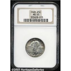 1920 25C MS65 NGC. Speckles of mauve and navy-blue color hug the borders of this lustrous and impressively preserved Gem. The waist and shield have pleasing definition, while the head and date are clear although not fully struck. Important notice: Heritage usually auctions material at the rate of 200-250 lots per hour. On some occasions eBay Live bid software or the Internet may not be able to keep up with the pace of the auction. We recommend placing a realistic absentee bid now as insurance to avoid disappointment. Occasionally the auctioneer may eliminate or reject an eBay Live bid, and the auctioneer may also reopen a lot after the close of the eBay live bidding (usually because we missed an audience bid), and may reject your bid even if it shows you as the winning bidder. By bidding via eBay Live, you agree that Heritage may award the lot to another bidder at its sole discretion under the circumstances described above or any other reasonable circumstances. Also please note that all Heritage lots purchased through eBay Live carry a 20% Buyer's Premium. Please make sure you read the Terms and Conditions before you bid.