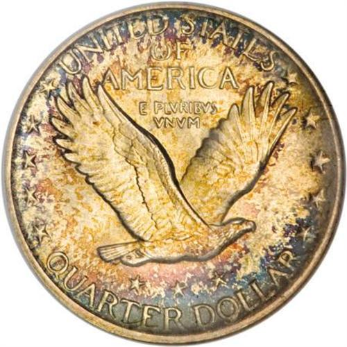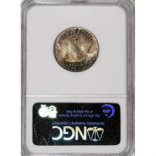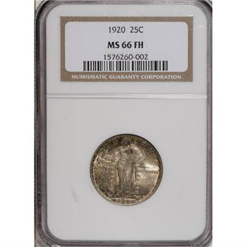 <B>1920 25C MS66 Full Head NGC.</B></I> Speckled gold, red, and blue patina race over the obverse, while splashes of sky-blue, lavender, and gold-brown dominate the reverse. A sharp strike emboldens the design elements, except for the usual softness on the 1 of the date. Lustrous surfaces have been well cared for.<BR><BR><B>Coin Engraver:</B> Hermon A. MacNeil<BR><BR><b>Shipping:</b> Coins & Currency (<a target="_blank" href="http://www.heritageauctions.com/common/shipping.php">view shipping information</a>)