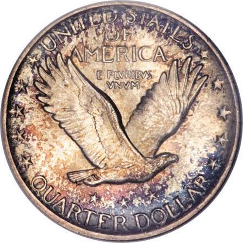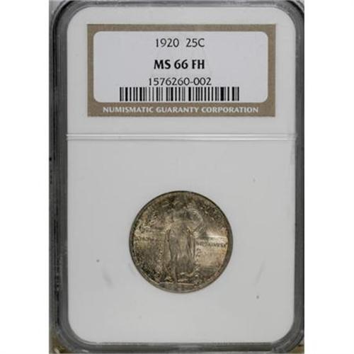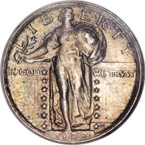 <B>1920 25C MS66 Full Head NGC.</B></I> Speckled gold, red, and blue patina enriches the obverse, while splashes of sky-blue, lavender, and gold-brown dominate the reverse. A sharp strike emboldens the design elements, particularly the shield rivets and waist. The date is slightly soft. Lustrous and unabraded save for a tick on the cheek. Census: 11 in 66 Full Head, 2 finer (2/08).<BR><BR><B>Coin Engraver:</B> Hermon A. MacNeil<BR><BR><b>Shipping:</b> Coins & Currency (<a target="_blank" href="http://www.heritageauctions.com/common/shipping.php">view shipping information</a>)