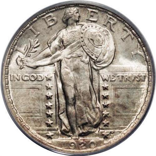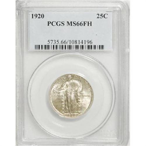 <B>1920 25C MS66 Full Head PCGS.</B></I> Both sides of this lovely Premium Gem are nicely matched with ivory mint frost and speckled gold toning. A powerful strike emboldens the design features, with crisp definition apparent in the chain mail, shield, and rivets, as well as fullness of head detail. A few grade-consistent marks do not detract. Population: 16 in 66 Full Head, 3 finer (11/07).<BR><I>From The Hoffy Collection, NGC's #3 Registry Collection of Standing Liberty Quarters.</B></I><BR><BR><B>Coin Engraver:</B> Hermon A. MacNeil<BR><BR><b>Shipping:</b> Coins & Currency (<a target="_blank" href="http://www.heritageauctions.com/common/shipping.php">view shipping information</a>)