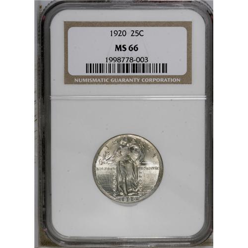 <B>1920<25C> MS66 NGC.</B></I> Thin arcs of powder-blue and gold patina are visible on the obverse. Highly lustrous with full rivets on the shield. Census: 56 in 66, 12 finer (9/06).