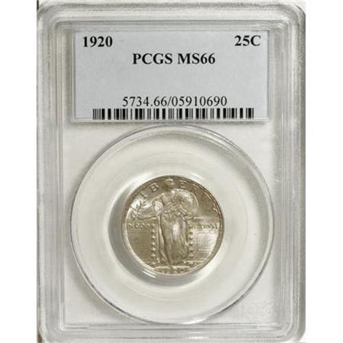 <B>1920 25C MS66 PCGS.</B></I> A lovely Premium Gem with nearly full head details. Both sides are frosty with brilliant silver luster and wispy gold toning. The shield is fully defined, and only the three leaves on Liberty's head are flat. All other head details are sharp and bold. Clearly far above average for the date.<BR><BR><B>Coin Engraver:</B> Hermon A. MacNeil<BR><BR><b>Shipping:</b> Coins & Currency (<a target="_blank" href="http://www.heritageauctions.com/common/shipping.php">view shipping information</a>)