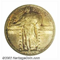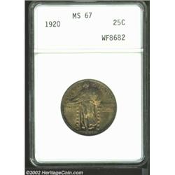1920 25C MS67 ANACS. The borders have rich coffee-gold patina, while the centers have lighter golden-brown color. A lustrous Superb Gem that has virtually pristine surfaces. While the leaf sprigs on Liberty's head are not fully struck, her waist and shield has exceptional detail, as does the breast of the eagle. Important notice: We expect to be auctioning lots at the rate of 200-250 per hour. Sometimes eBay Premier live bid software cannot keep up with that pace, so we strongly recommend that you place a realistic proxy bid now as insurance to avoid disappointment. Also please note that all Heritage/CAA lots purchased through eBay Premier carry a 20% Buyer's Premium. Please make sure you read the Terms and Conditions.