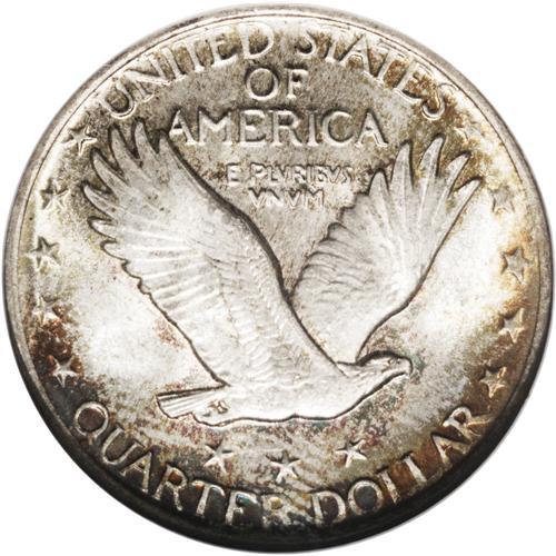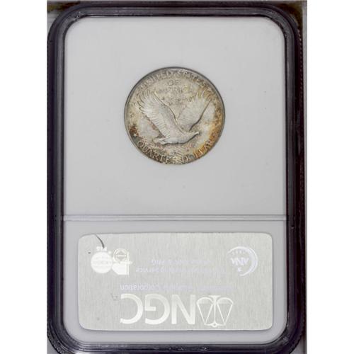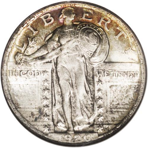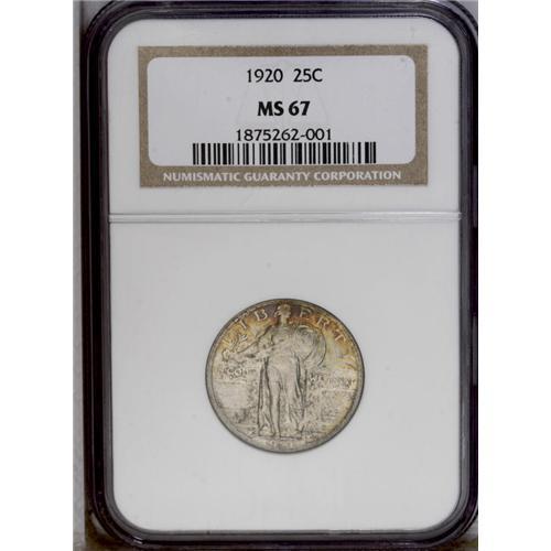 <B>1920<25C> MS67 NGC.</B></I> Even though the 1920 has the highest mintage in the Standing Liberty quarter series, its availability in the better grades of Uncirculated is no greater than later dates with significantly lower mintages. At the Superb Gem level, NGC and PCGS together have certified only 16 pieces, and <I>none</B></I> finer (3/06)! This specimen is well struck, showing decent (though not full) definition on Liberty's face. Most of the rivets are strong, with only the two near Liberty's midsection showing minor softness. The first digit of the date is also weak. Lustrous surfaces are well preserved, revealing no mentionable contact marks, and are visited by splotches of medium-intensity multicolored toning, especially at the borders.