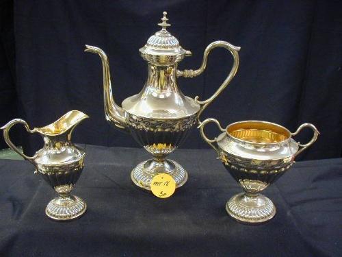 1920 3 PC CHROME TEA SET INCUDES (1) 13in TEA POT, (1) FTD. DBL. HND. OPEN SUGAR W/GOLD WASH, (1) FTD. CREAMER W/GOLD WASH INTERIOR, 3 PC