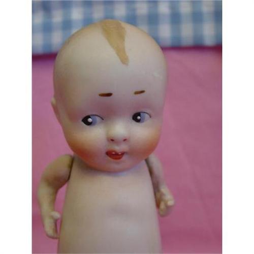 1920-30's All 5 1/2in Bisque Googlie Boy. Inmobile bisque boy, arms move, with googlie eyes, and open smiling mouth with 2 tiny teeth. Is in very good condition except for tiny ruboffs on the side of the face. Very cute charming figure to add to your collection! (Item #80000158)