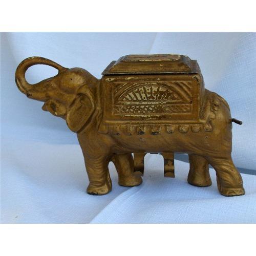 Rare and hard to find 1920-30's cast iron Elephant Cigarette Dispenser. This item is gold painted and original with a decal from the Chicago Worlds Fair 1933 on the lid. Parts of the decal are missing, but from the graphics, with the Art Deco style, you can tell its the same as the one used on the box camera in "Worlds Fair Collectibles" by Howard M Rossen, a Schiffer Book, page 35. The box on top holds the cigarettes, just turn the tail, the cigarette falls into a cradle under its stomach. Condition is very good, with some paint loss due to age. No breaks or repairs. All original except the felt pads on the feet. This piece is very special and would be a wonderful addition to any collection. See photos. Have a look at my other items. Thank you for viewing.,