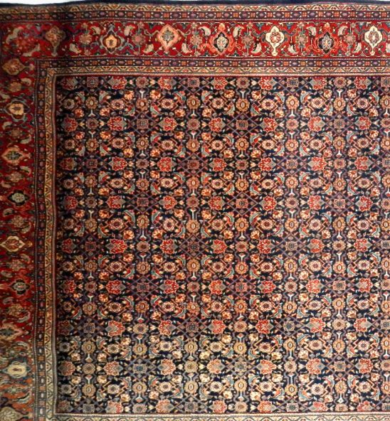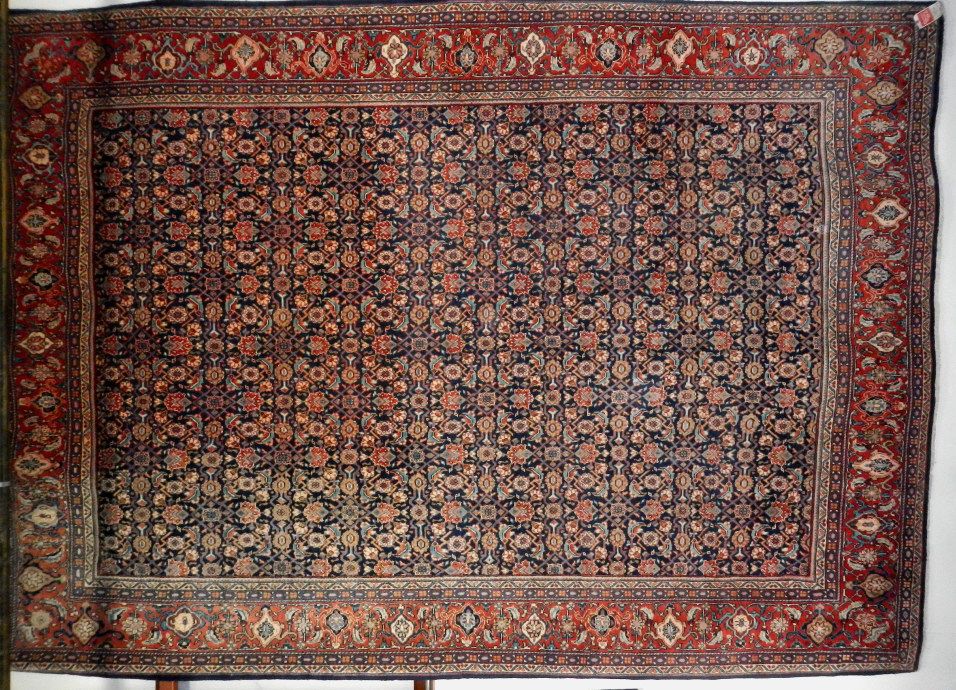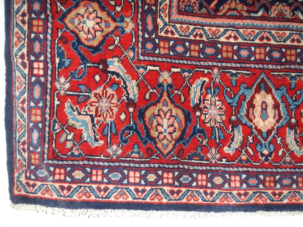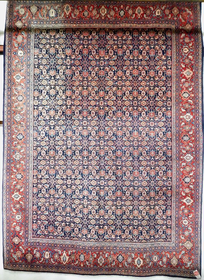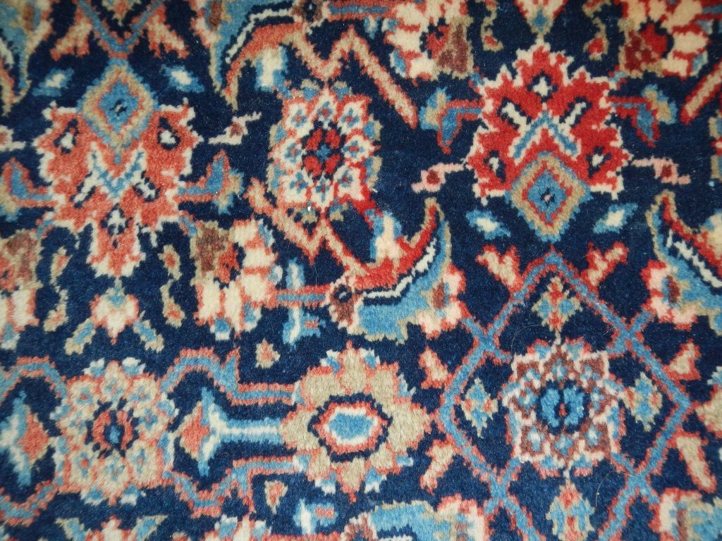 1920-30's Sarouk Persian Rug - This is a hand knotted rug with 100% wool pile and is a genuine Persian Oriental Rug. Sarouk (also Saruk or Sarough) rugs are those woven in the village of Saruk and also the city of Arak, Iran and the surrounding countryside. Sarouk rugs have been produced for much of the last century. The early successes of the Sarouk rug are largely owed to the American market. From the 1910s to 1950s, the “American Sarouk” also known as the “Painted Sarouk” was produced. In the picture of the rug there is a black line which is a shadow from the building and is not a stain. This rug is Abrash as you can see in the top right corner. This is a true hand knotted rug and abrash is when the hand tribal weaver runs out of a certain dye and ten gets more. It shows more character in the Rug. This rug measures 10.3'x14.4' Inventory #4571