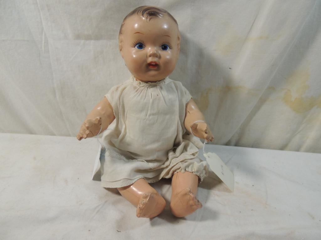 PAINTED MOLDED CURLS, BLUE EYES & 2 UPPER TEETH, ORIGINAL DRESS AND SLIP, VERY SWEET LOOK AS SHOWN SEE PHOTO FOR MORE DETAILS.