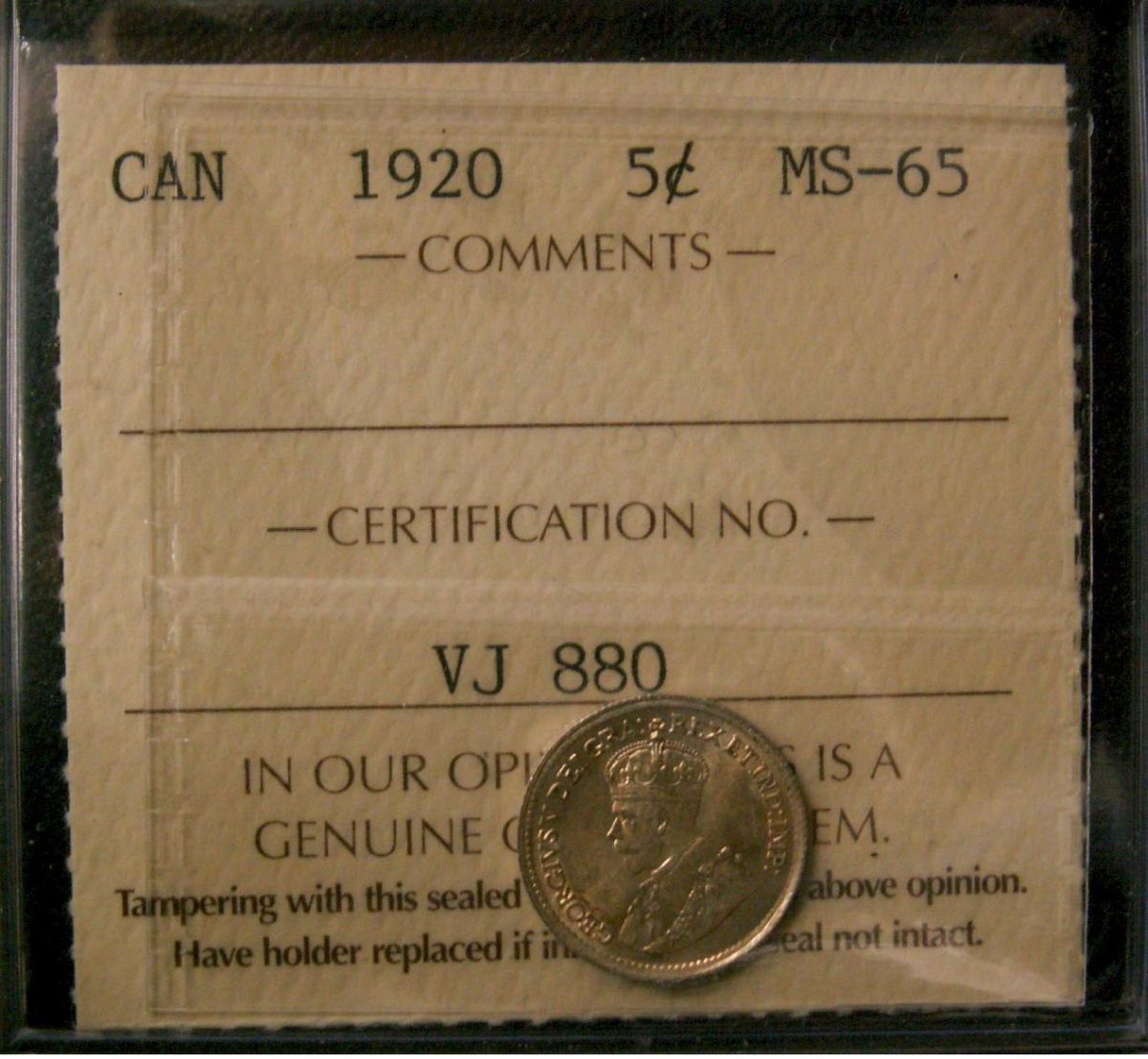 1920 5¢ ICCS MS65. Lustrous with shades of golden tone.