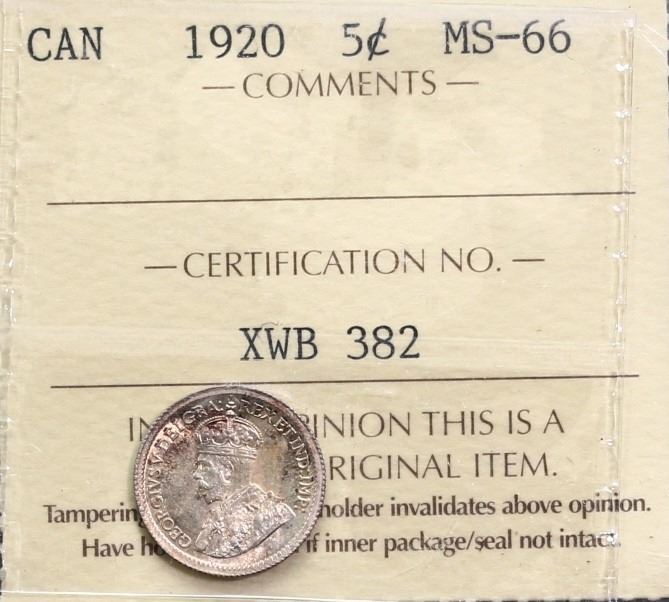 1920 5¢ PCGS ICCS Superb Gem Mint State-66. Vivid lustrous fields with some peripheral tones.