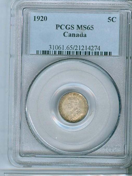 1920 5¢ PCGS MS65. Lustrous and light rim tone.
