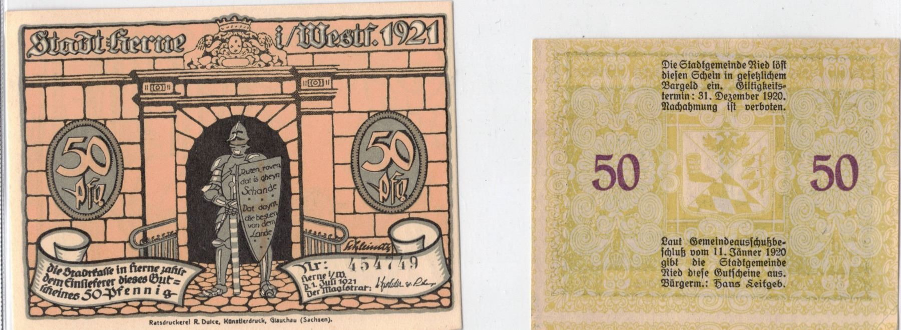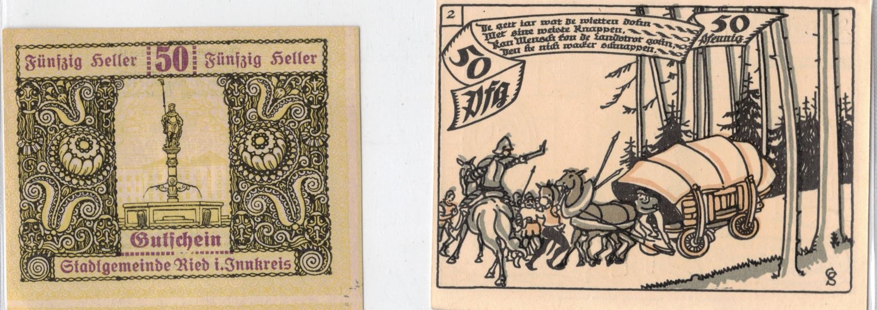 1920 50 Heller Note and 1921 50 Pfennig Note