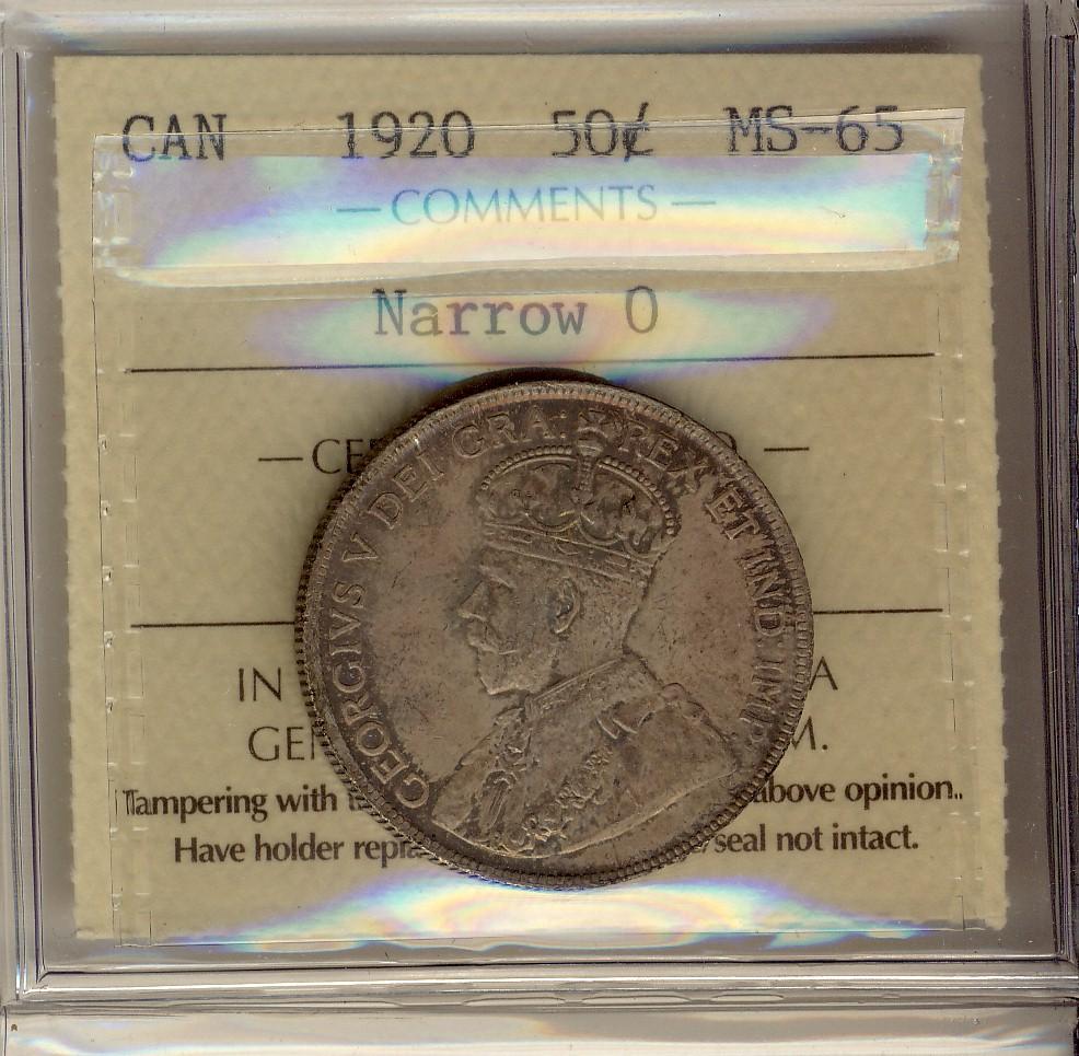 1920 50¢ Narrow 0 ICCS MS65. Gem creamy pinkish tone with underlying lustre. Tied for finest graded.