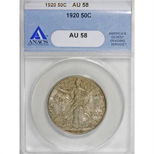 <B>1920 50C AU58 ANACS.</B></I> NGC Census: (81/515). PCGS Population (98/663). Mintage: 6,372,000. Numismedia Wsl. Price for NGC/PCGS coin in AU58: $167. (#6580)<BR><BR><B>Coin Engraver:</B> Adolph A. Weinman<BR><BR><b>Shipping:</b> Coins & Currency (<a target="_blank" href="http://www.heritageauctions.com/common/shipping.php">view shipping information</a>)
