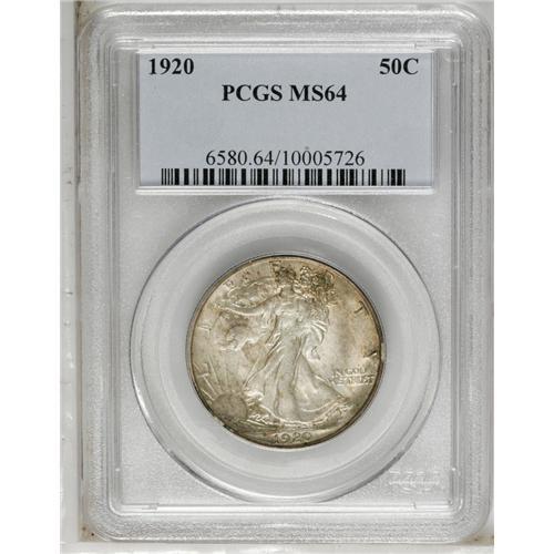 <B>1920<50C> MS64 PCGS.</B></I> One of the more available early Walkers, this piece displays an above average strike for the series. While we note trivial softness on the eagle's right (facing) leg, Liberty's hand and gown lines are rather bold. Variegated earth tones embrace the lustrous surfaces, mainly in the fields and near the borders, and conceal any minuscule abrasions that may be present. An attractive piece for a near-Gem date set.