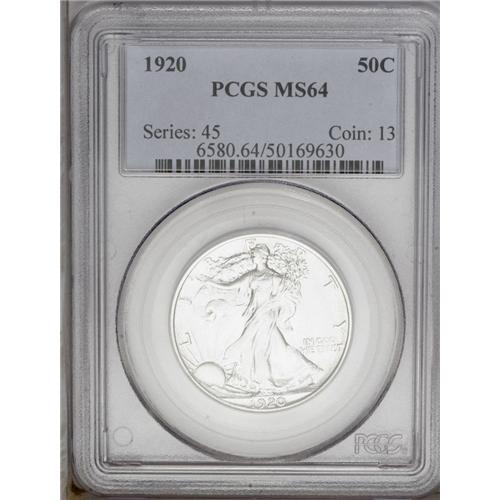<B>1920<50C> MS64 PCGS.</B></I> This fully brilliant and shimmering Choice Walking Liberty half has a decent strike and generally smooth surfaces. A good value, when compared with a costly MS65 example.