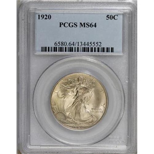 <B>1920 50C MS64 PCGS.</B></I> Delicate gold and tan accents grace the otherwise silver-gray surfaces of this softly lustrous early Walker. Well struck with faint, scattered marks that preclude a finer grade.<BR><BR><B>Coin Engraver:</B> Adolph A. Weinman<BR><BR><b>Shipping:</b> Coins & Currency (<a target="_blank" href="http://www.heritageauctions.com/common/shipping.php">view shipping information</a>)
