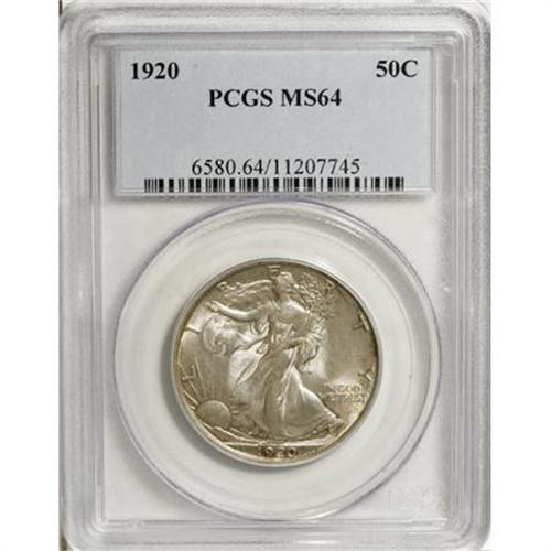 <B>1920 50C MS64 PCGS.</B></I> Sharply struck with crisp details noted on Liberty's head, branch hand, and feet. Satin luster illuminates steel-gray surfaces that show some speckled russet and gold patina near the peripheries. Surface marks are nearly nonexistent. <BR><BR><B>Coin Engraver:</B> Adolph A. Weinman<BR><BR><b>Shipping:</b> Coins & Currency (<a target="_blank" href="http://www.heritageauctions.com/common/shipping.php">view shipping information</a>)