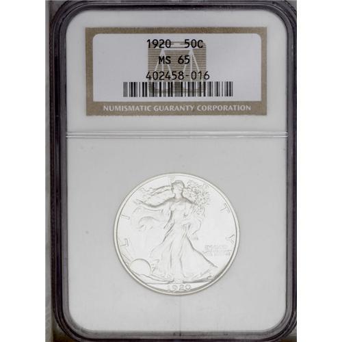 <B>1920<50C> MS65 NGC.</B></I> The 1920-P is not at all common in grades above the MS64 level with only 16 examples thus far certified by both services combined. This is a frosty-white Gem with full, bountiful luster over features that are sharply struck in all areas save for the centers. There is, nonetheless, emerging definition over Liberty's right (facing) hand, and we cannot find a single abrasion that if worthy of mention. A trio of small reverse spots are located around the LA in DOLLAR. Census: 37 in 65, 5 finer (3/06).