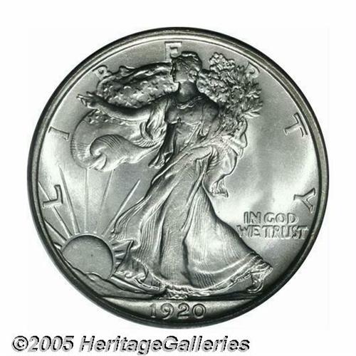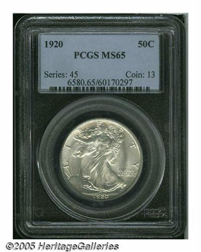 <B>1920<50C> MS65 PCGS.</B></I> Among all of the early Walking Liberty Half Dollars (those struck before 1934), the 1920 Philadelphia issue is one of the more underrated examples and is seldom encountered in Gem quality. There are many other dates in the series that are much more highly regarded. This lovely Gem is sharply struck and fully lustrous with brilliant silver surfaces. There is no evidence of toning on either side. It is a pristine coin that will be appreciated by the specialist. Population: 62 in 65, 11 finer (5/05).