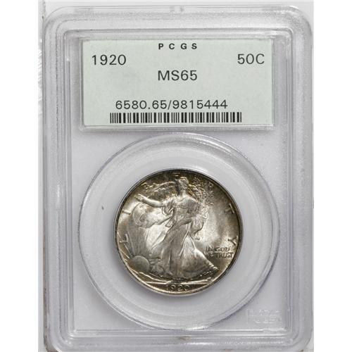 <B>1920<50C> MS65 PCGS.</B></I> Autumn-brown toning adorns the margins, while the dove-gray centers display occasional tan freckles. The centers show slight incompleteness of strike, as usual for the type, but the preservation and originality are unassailable. Housed in a green label holder. Population: 73 in 65, 11 finer (9/06).
