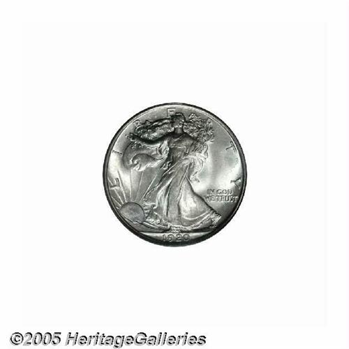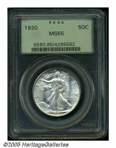 <B>1920<50C> MS65 PCGS.</B></I> Gentle wisps of chestnut color endow this lustrous and sharply struck Gem. Thorough evaluation does not reveal any remotely relevant marks. Although the 1920 is not a rarity when compared with its famous low mintage 1921 successor, the 1920 is very scarce as a Gem. Struck from moderately rotated dies, and housed in an old green label holder.