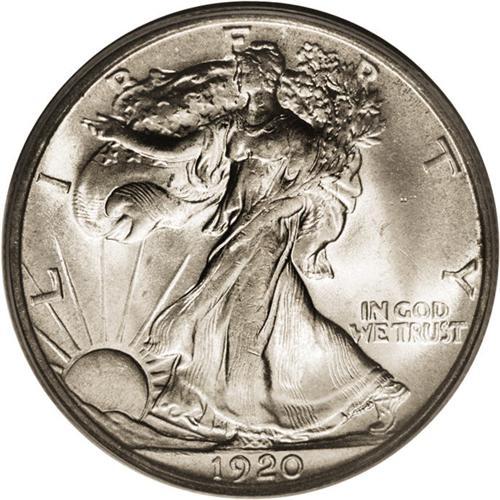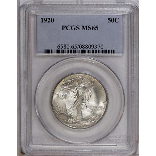 <B>1920<50C> MS65 PCGS.</B></I> The mintage for this issue was more than six times that of its 1919 Philadelphia Mint counterpart. This Gem displays excellent striking details, with only the eagle's right (facing) leg feathers appearing to be somewhat soft. It is lustrous and bright on the obverse, where a couple of minor blemishes are noted in the right field area. The reverse has a coating of drab brownish-gray patina. Population: 73 in 65, 11 finer (8/06).<BR><I>From The Big Tex Registry Set of Walking Liberty Halves.</B></I>