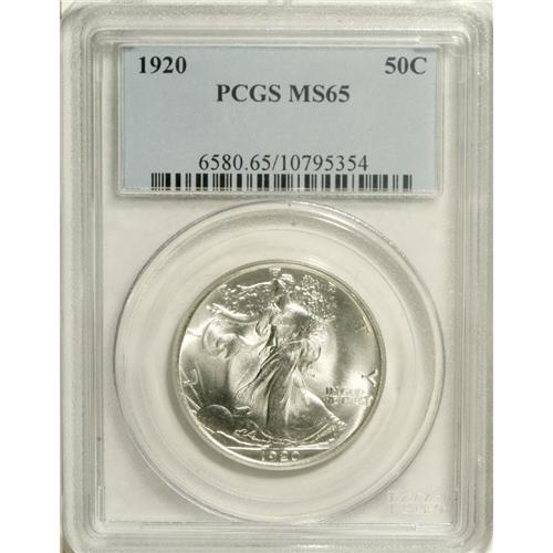<B>1920 50C MS65 PCGS.</B></I> This is quite an unusual coin. The Walking Liberty half series can be divided into two striking periods, 1916-1929 and 1933-1947. Specialists subdivide the series once again with the middle dates from 1933-1940 making a third group. Each of the major groups has distinctive strike and luster characteristics, and knowing these differences is what makes this coin so unusual. If the date were covered, this piece could be mistaken for a 1940-S or 1941-S. The mint frost is just that pronounced. Also, the striking definition is exceptionally strong for an early Walker. Brilliant throughout and free from any noticeable abrasions. This is a coin that specialists should take careful note of, as few other 1920-P Walkers will ever be offered with overall surfaces like this piece.<BR><BR><b>Shipping:</b> Coins & Currency (<a target="_blank" href="http://www.heritageauctions.com/common/shipping.php">view shipping information</a>)