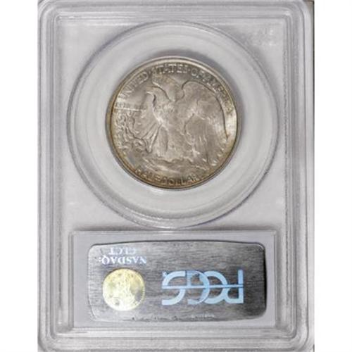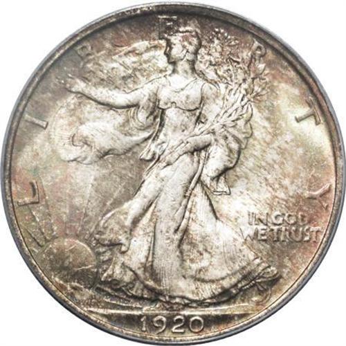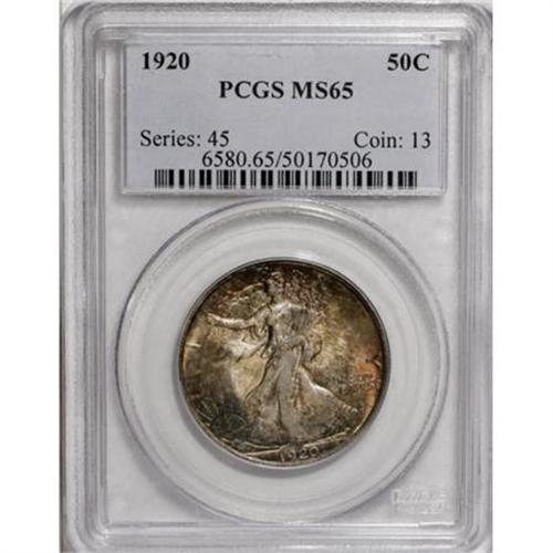 <B>1920 50C MS65 PCGS.</B></I> The obverse is pleasantly toned in mottled tangerine, olive, and bronze shades. Lighter gray color, with a touch of gold, occupies the reverse. Thick and frosty luster permeates both sides and just a handful of minor contact marks are noted on Liberty's leg. There are surprisingly few Gem and finer 1920 Walkers extant today from the substantial mintage of more than six million pieces. Population: 76 in 65, 11 finer (11/07).<BR><BR><B>Coin Engraver:</B> Adolph A. Weinman<BR><BR><b>Shipping:</b> Coins & Currency (<a target="_blank" href="http://www.heritageauctions.com/common/shipping.php">view shipping information</a>)