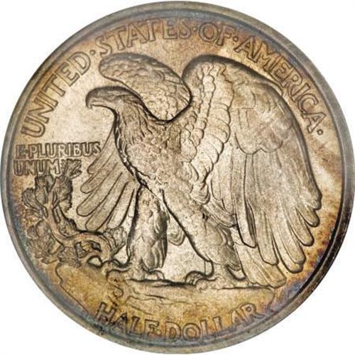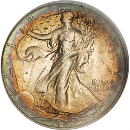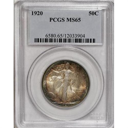 <B>1920 50C MS65 PCGS.</B></I> This Gem half dollar displays a better-than-average strike, revealing as it does sharp definition on the branch hand and most of the eagle's feathers. Slivers of electric-blue, lavender, and golden-tan color gather at the peripheries, leaving the centers essentially color free. Highly lustrous surfaces show a few light grade-consistent marks. Population: 76 in 65, 11 finer (12/07).<BR><BR><B>Coin Engraver:</B> Adolph A. Weinman<BR><BR><b>Shipping:</b> Coins & Currency (<a target="_blank" href="http://www.heritageauctions.com/common/shipping.php">view shipping information</a>)