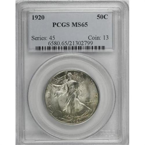 <B>1920 50C MS65 PCGS.</B></I> This boldly struck and thoroughly lustrous Gem features olive-gold and pearl-gray toning. Even the aid of a loupe is unable to locate consequential marks. Although the 1920 is common in circulated grades, and relatively available in MS62 through MS64, Gems are both scarce and desirable.<BR><BR><B>Coin Engraver:</B> Adolph A. Weinman<BR><BR><b>Shipping:</b> Coins & Currency (<a target="_blank" href="http://www.heritageauctions.com/common/shipping.php">view shipping information</a>)