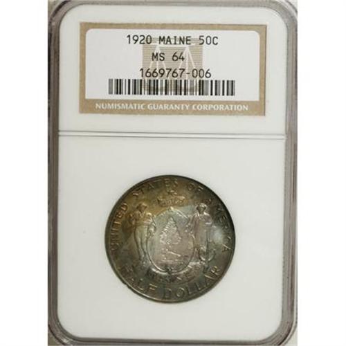 <B>1920 50C Maine MS64 PCGS.</B></I> PCGS Population (1106/1160). NGC Census: (995/1026). Mintage: 50,028. Numismedia Wsl. Price for NGC/PCGS coin in MS64: $258. (#9326)<BR><BR><b>Shipping:</b> Coins & Currency (<a target="_blank" href="http://www.heritageauctions.com/common/shipping.php">view shipping information</a>\)