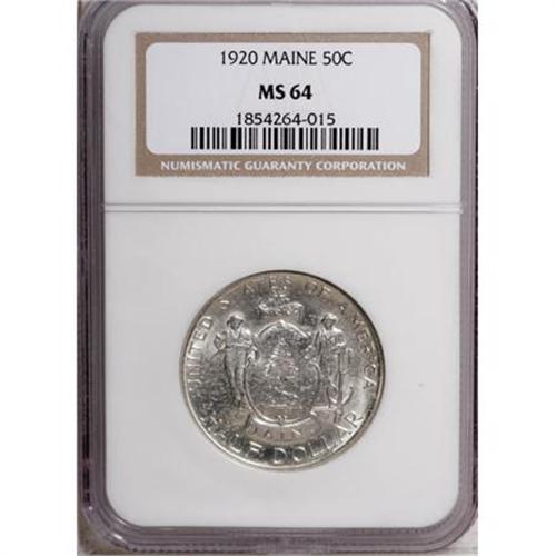 <B>1920 50C Maine MS64 NGC.</B></I> NGC Census: (1004/1031). PCGS Population (1106/1160). Mintage: 50,028. Numismedia Wsl. Price for NGC/PCGS coin in MS64: $258. (#9326)<BR><I>From The Frank DuVall Collection of U.S. Commemoratives.</B></I><BR><BR><b>Shipping:</b> Coins & Currency (<a target="_blank" href="http://www.heritageauctions.com/common/shipping.php">view shipping information</a>\)